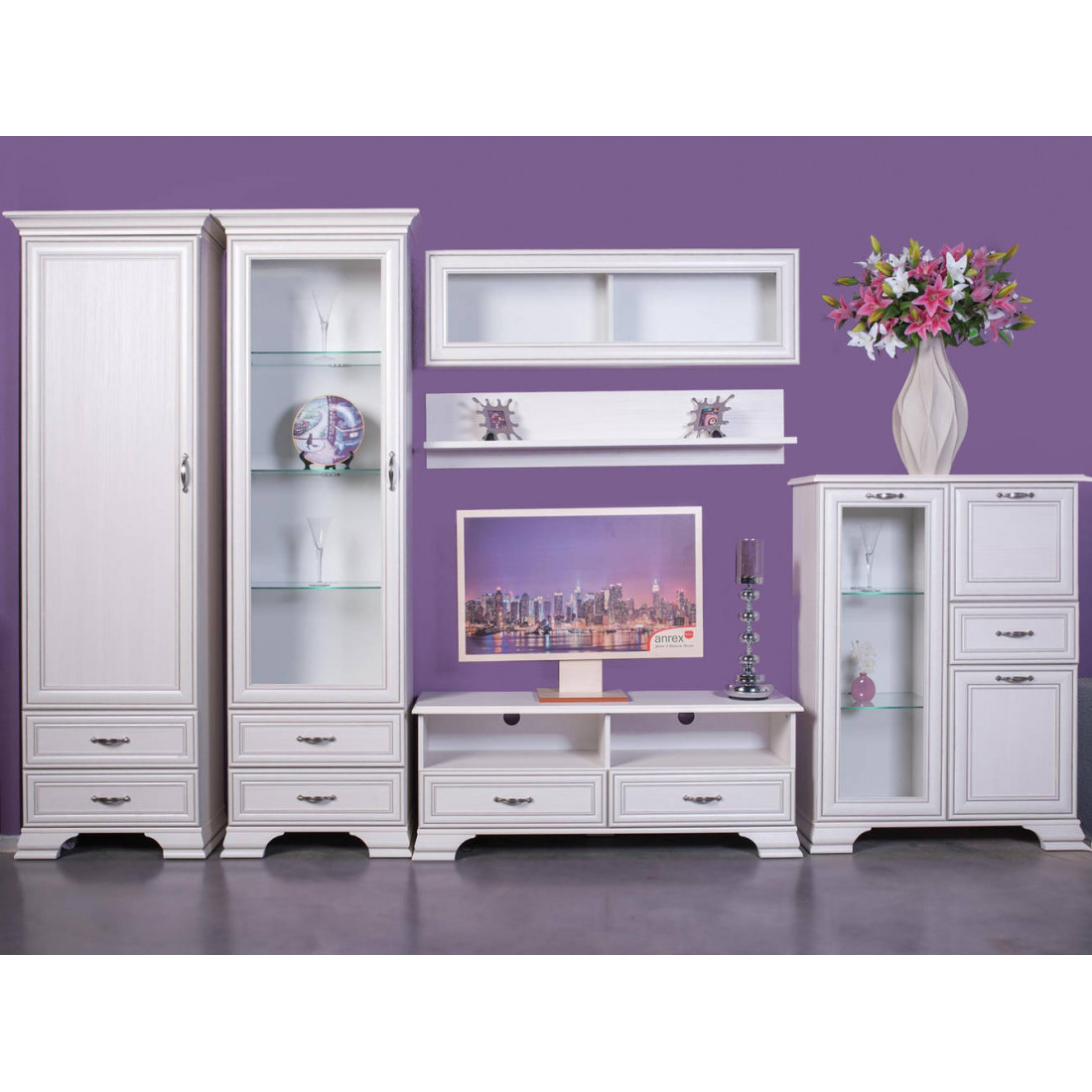Гостиная Тиффани - это классика, которая всегда остается модной и стильной. Сочетание светлого оттенка с древесной структурой, нежных фасадов, обрамленных изящными планками с патиной и качественных металлических ручек создадут атмосферу тепла и уюта, а возможность использования подсветки делает эту коллекцию особенно привлекательной. Основное достоинство TIFFANY - эстетическая функциональность, которая роскошно дополнит различный по назначению интерьер.