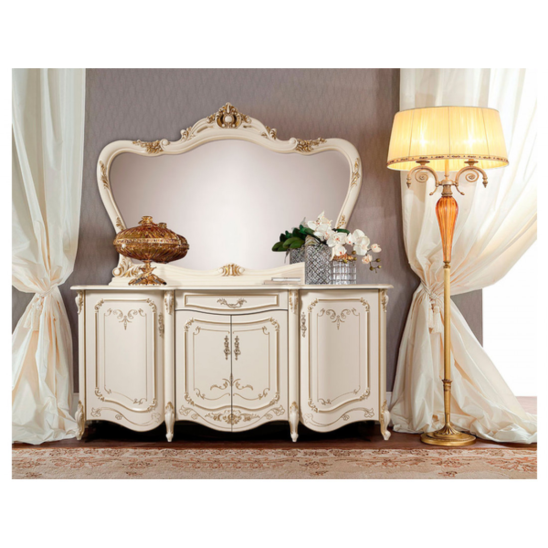 Комод для посуды с зеркалом Элиза (беж) – данная модель сделает вашу гостиную неповторимой и придаст ей богатую атмосферу. Он имеет четыре дверцы за которыми скрываются большие вместительные полки, что с легкостью поможет вам хранить все необходимые вещи. По середине есть не большая вытягивающаяся полка, которая по бокам имеет две ручки в виде кнопки. Комод «Аллегро» идет в комплекте с большим зеркалом которое украшено резной вставкой в сочетании с тонкой росписью, что подчеркнет классический стиль и послужит показателем богатства и престижа хозяев дома.