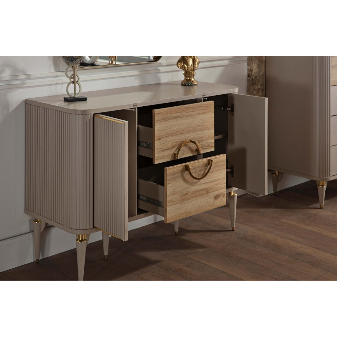 Туалетный столик Санвито SANV-23 один из элементов турецкой коллекции SANVITO. Прекрасное дополнение интерьера спальни, гостиной, залы. Столик обладает сравнительно небольшими размерами 1,170 мм x 470 мм x 830 мм. Может использоваться как дамский столик или как комод. Имеет два больших вместительных выдвижных ящика по центру, и полки для хранения за дверцами фасадов. Кремовый оттенок фасадов, наряду с рифленой поверхностью комбинируется с древесной фактурой ящичков. Оригинальный дизайн и теплые, нежные тона в сочетании с функциональностью столика-комода Санвито SANV-23 делают его изящным и привлекательным.