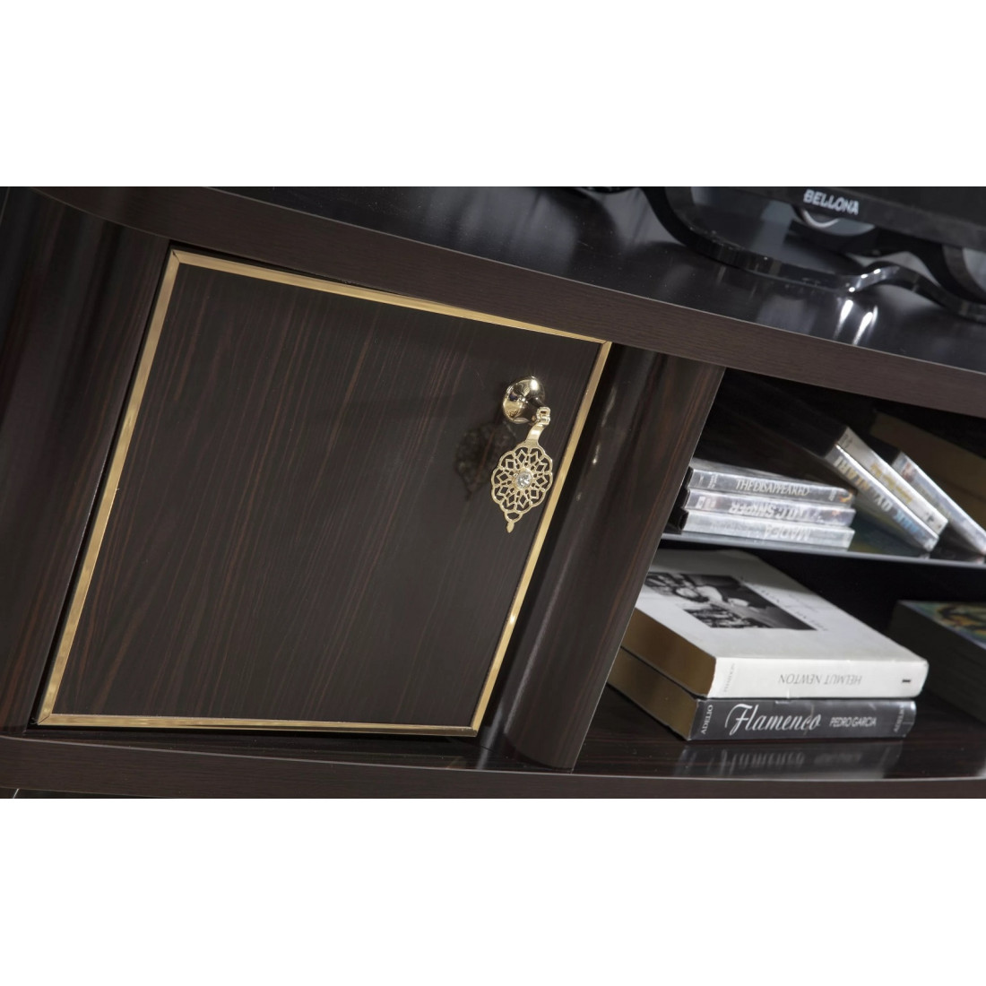Тумба под ТВ "Легенда" предназначена для размещения большого плазменного телевизора. Ее дизайн заслуживает Вашего внимания, изделие представлено в классическом белом стиле с золотистыми полосами на дверцах и белыми изогнутыми сужающимися к полу ножками. По центру тумбы находится углубление под два отделения, разделенные стеклянной полкой. За счет использования высококачественных материалов, удалось добиться долговечности данного изделия.