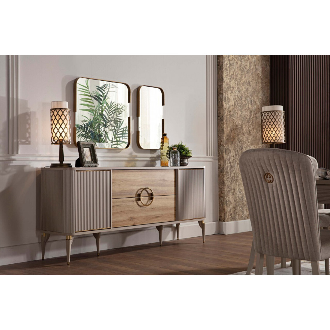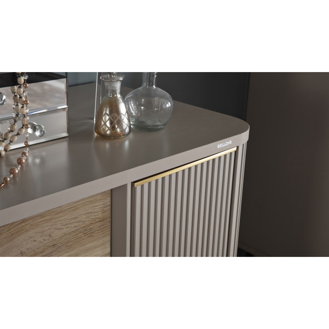 Тумба Санвито SANV-10 от турецкого производителя Bellona станет украшением Вашей гостиной, столовой, залы как в квартире. так и загородном доме. Достаточно длинная (185см),неглубокая (48см), но вместительная, она может использоваться как прилавок, буфет, комод. Тумба Sanvito имеет два глубоких ящика, а также внутренний потайной ящичек для столовых приборов или разных мелочей. Округлые, плавные формы тумбы прекрасно сочетаются с оригинальными ножками. Вертикальные линии фасадов кремового цвета в обрамлении золотистой каймы дополняют древесную фактуру центральных ящиков. Круглая золотистая ручка ящиков подчеркивает оригинальность дизайна.